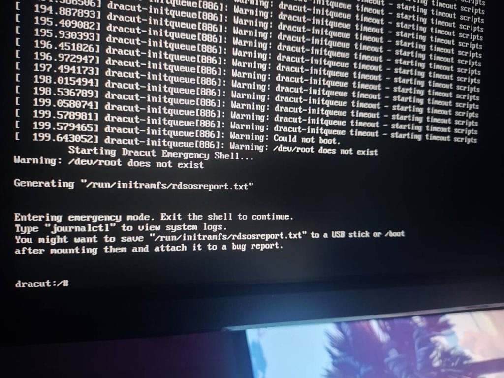 在提示Warning :dracut-initqueue timeout – starting timeout scripts界面输入 reboot 重启